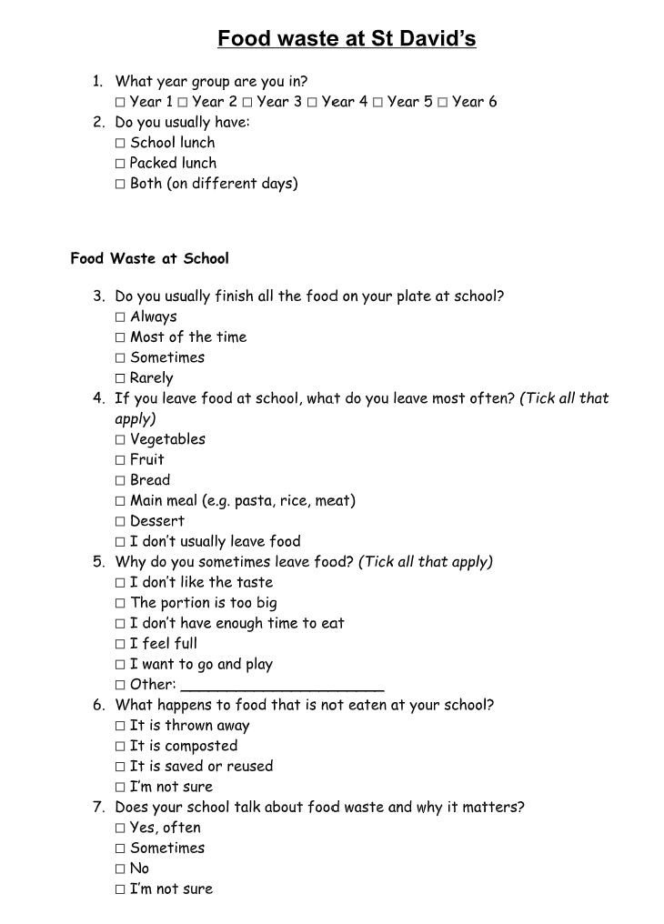 We have designed a questionnaire to start our mission to try to work out why we have food waste at school because the food Mrs Isaac cooks is so delicious. . Following this, we will get to work with an action plan. We may also try to tackle food waste at home too.